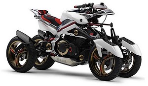 Ce concept sied bien à cette moto que Yamaha à doté de quatre roues inclinables et verrouillables, de deux moteurs, et d’une plastique pour le moins surprenante à mi-chemin entre une R6 et une machine de cross, avec un petit air d Bimota Tesi 3D |